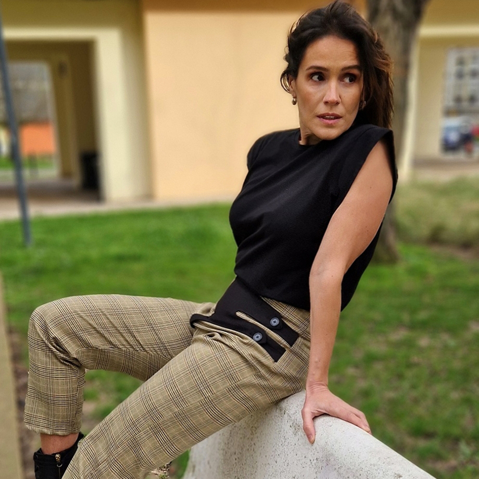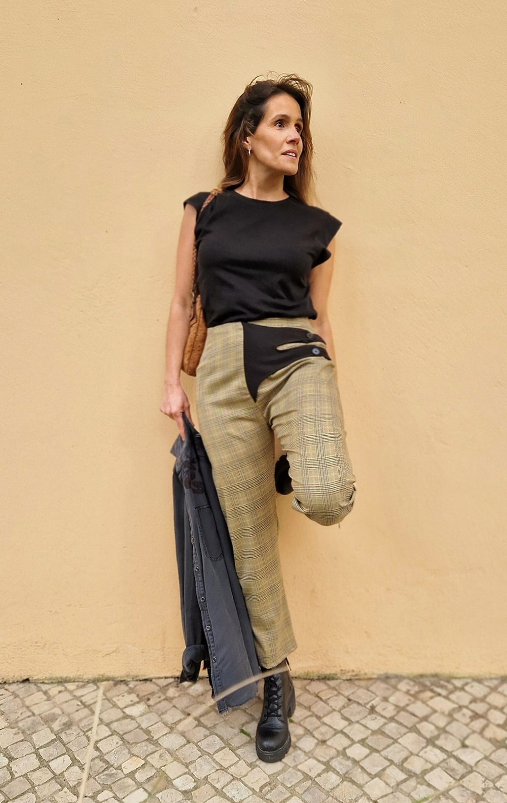 Estas calças são muito COOL. Além de muito confortáveis e giras, fazem ótima figura, devido ao seu corte. Tem fecho central invisível pela aba lateral que cria uma assimetria, o que tornam estas calças incríveis e com um design único.