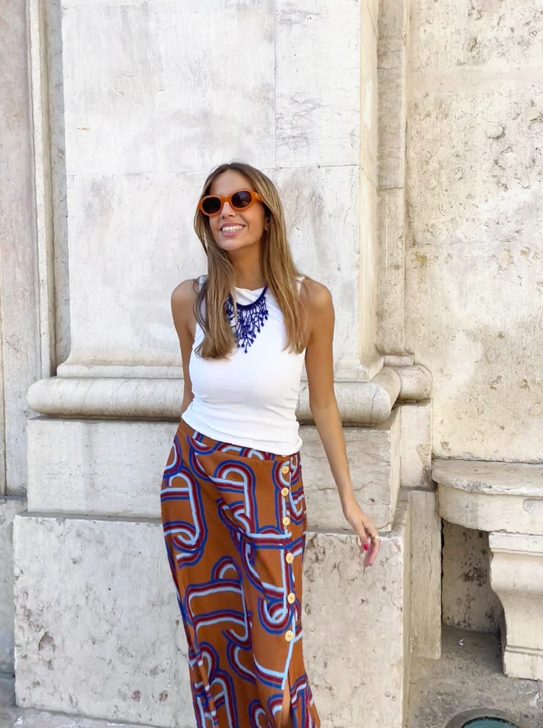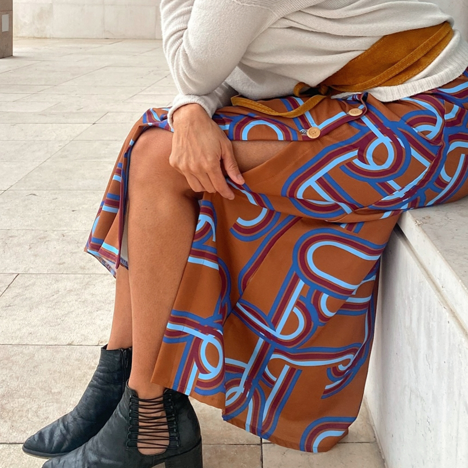 Saia muito confortável e feminina. Com botões na lateral que lhe dão fluidez e movimento.