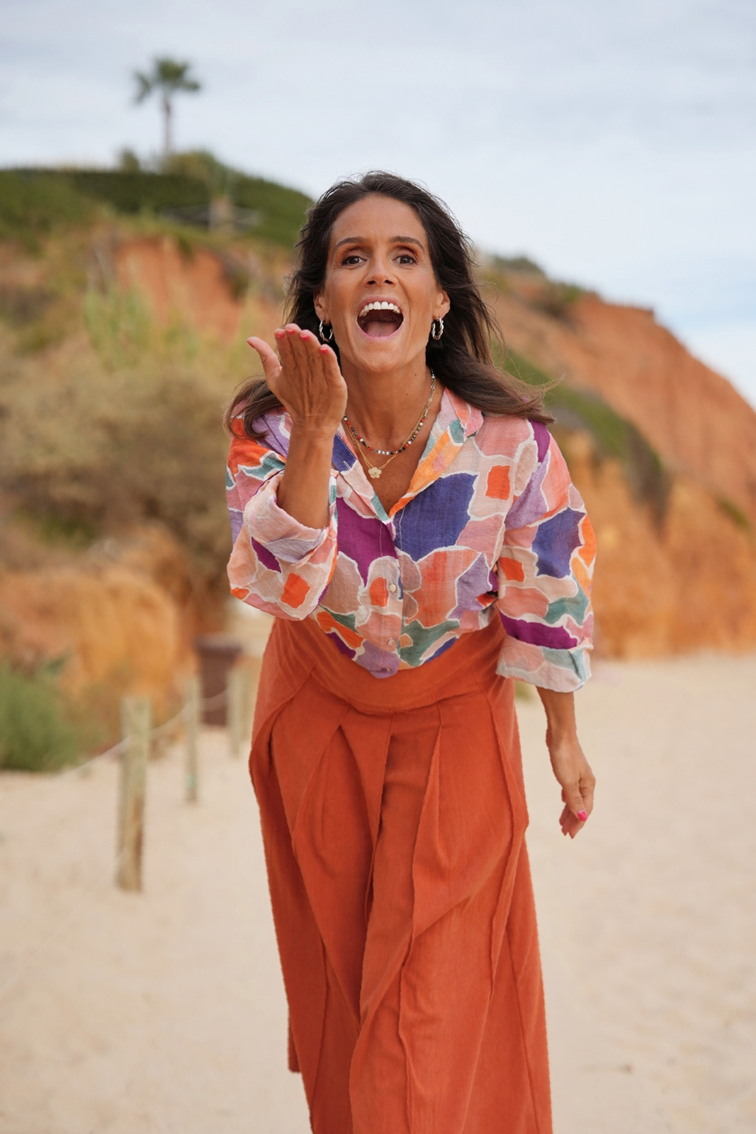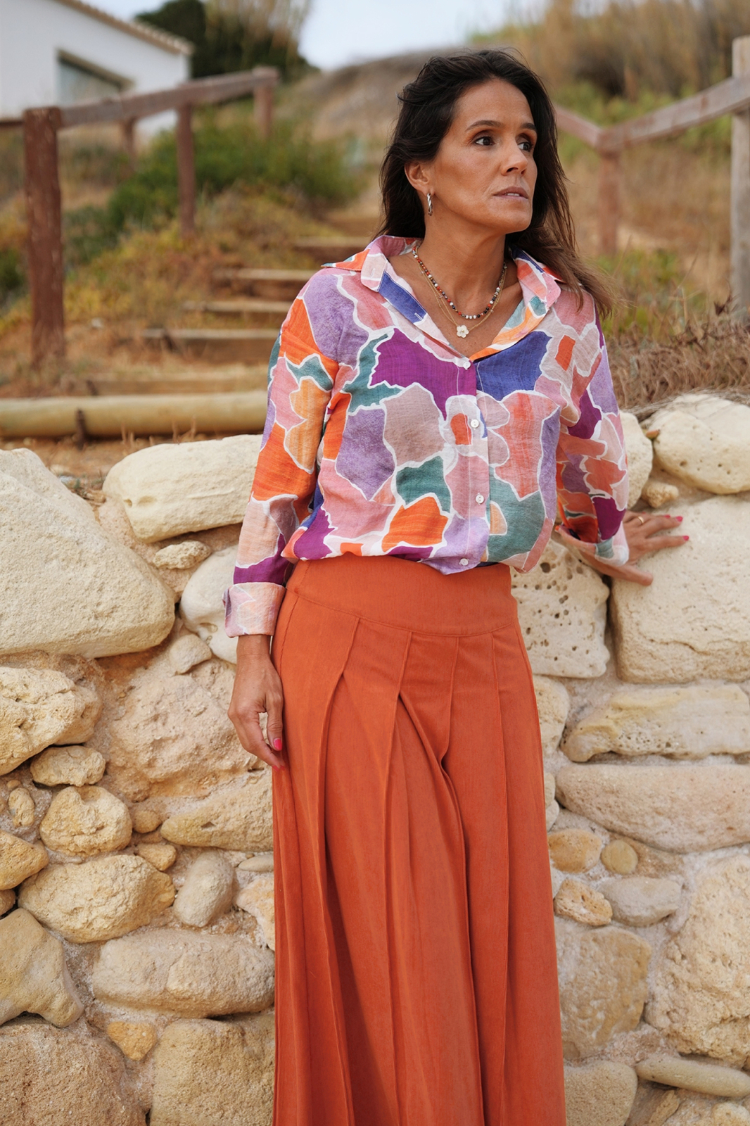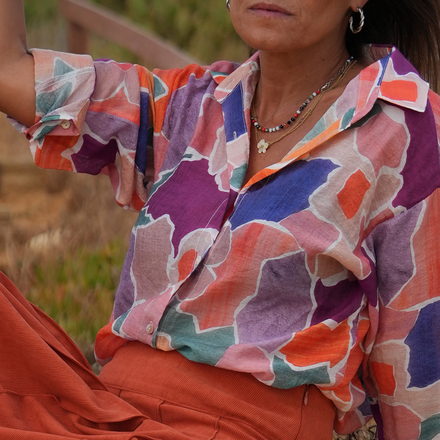 Esta camisa pode ser usada toda fechada ou com um top por baixo.