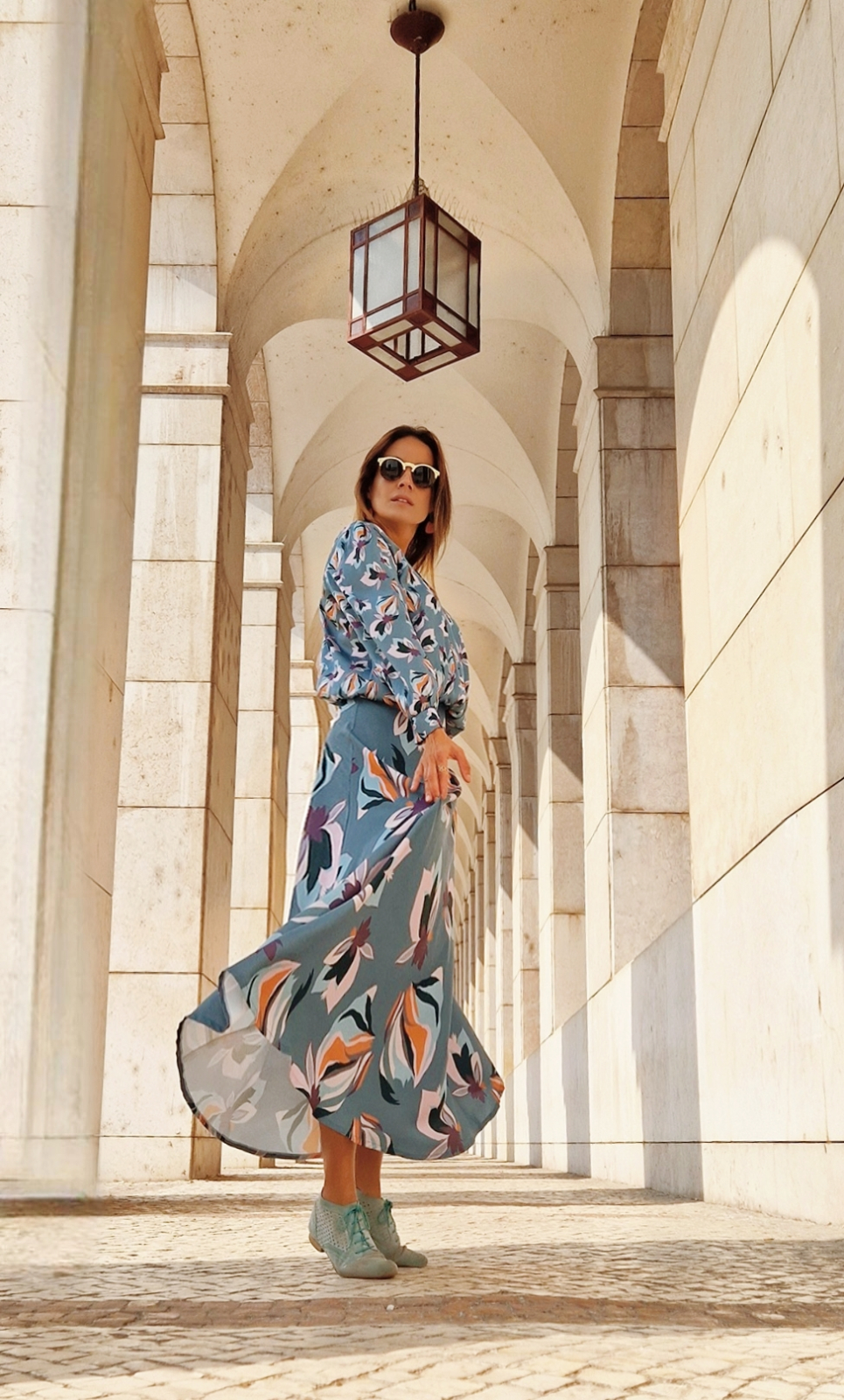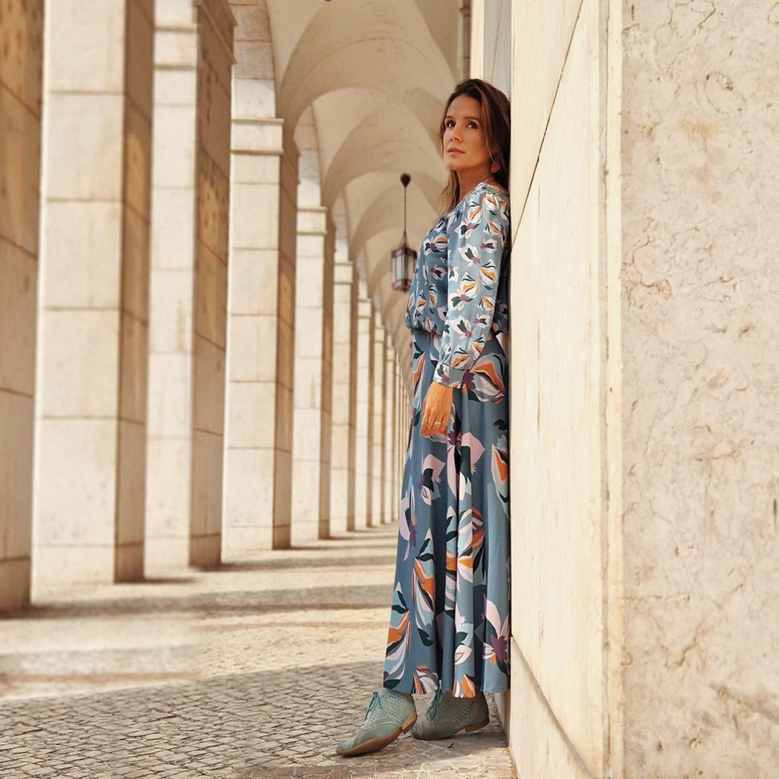 Este vestido é blusado na parte superior por ter elástico em toda a cintura. Fluído e descontraído, este vestido assenta bem em qualquer corpo.