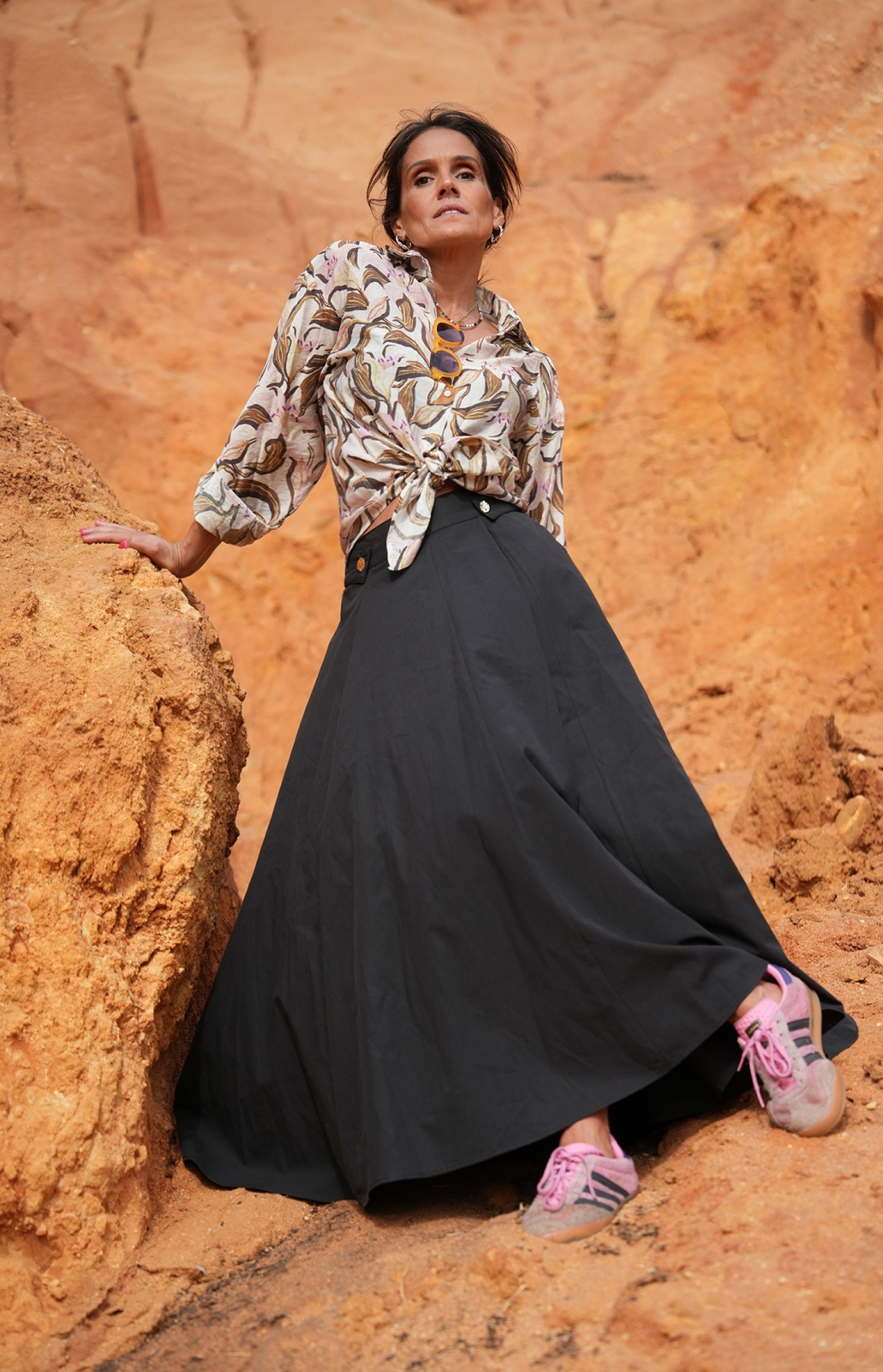 Esta camisa pode ser usada toda fechada ou com um top por baixo.