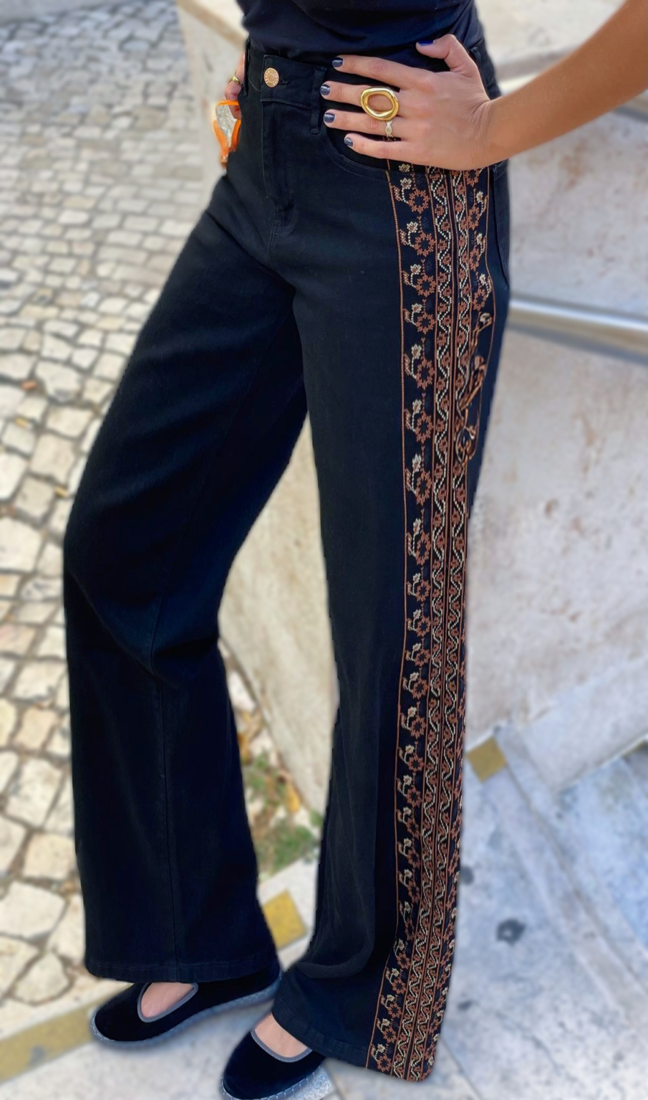 Os bordados laterais só fazem com que estas calças tenham mesmo muita pinta.
