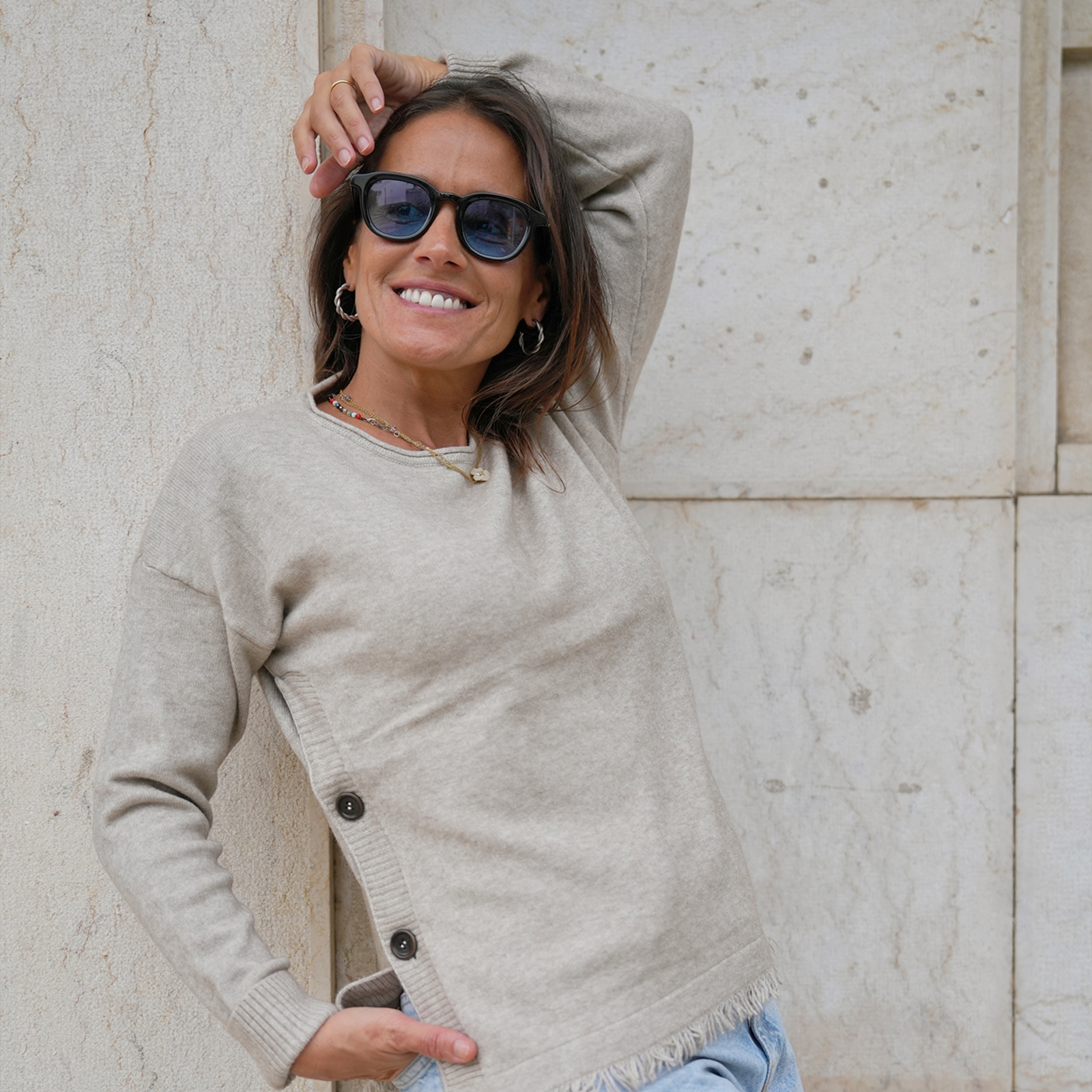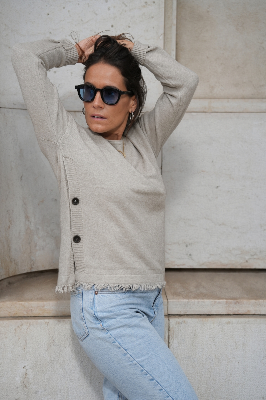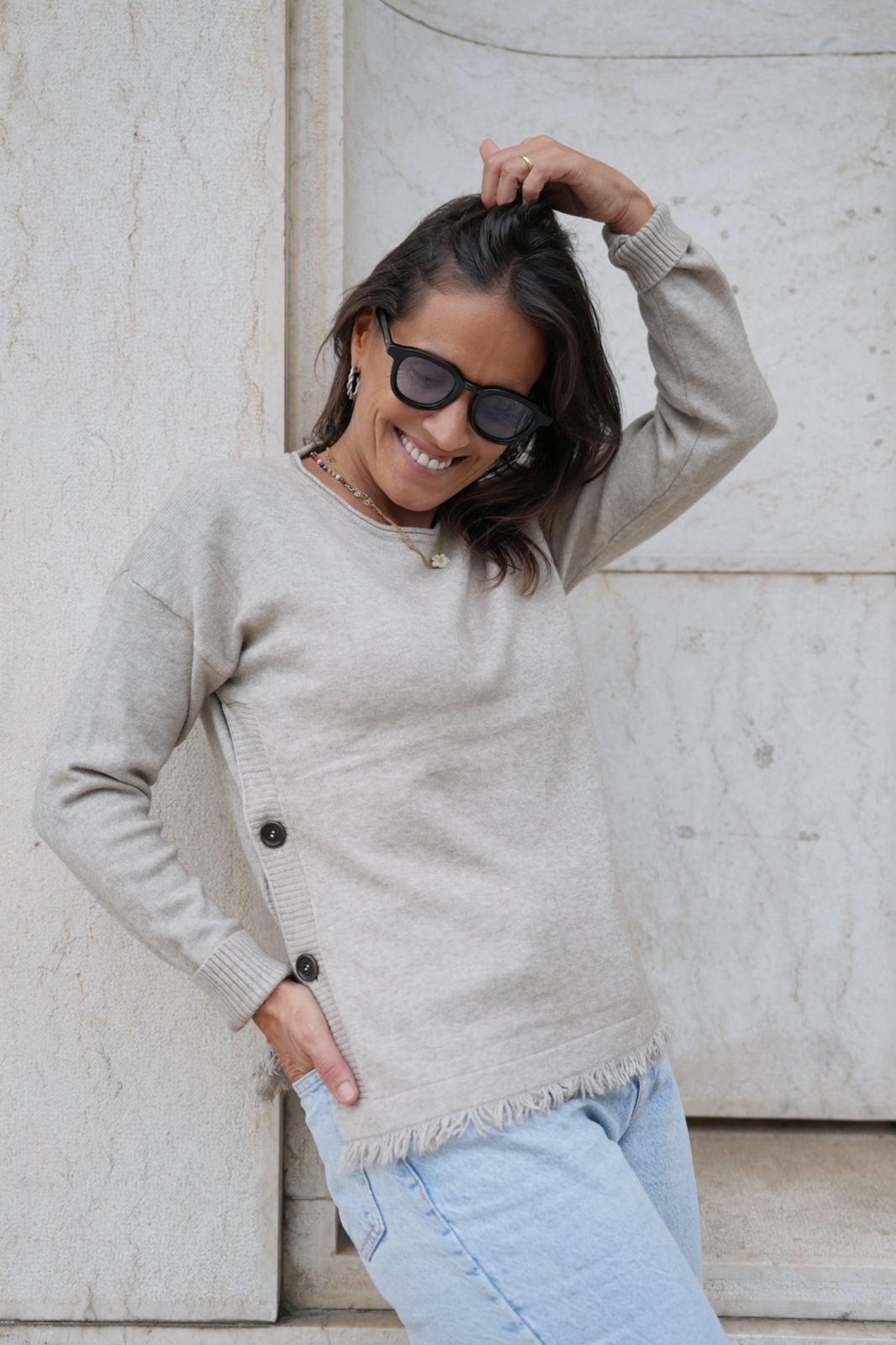 Os botões além de dar um toque super cool, também permitem que possa colocar a parte da frente para dentro das calças e deixar a parte de trás solta.