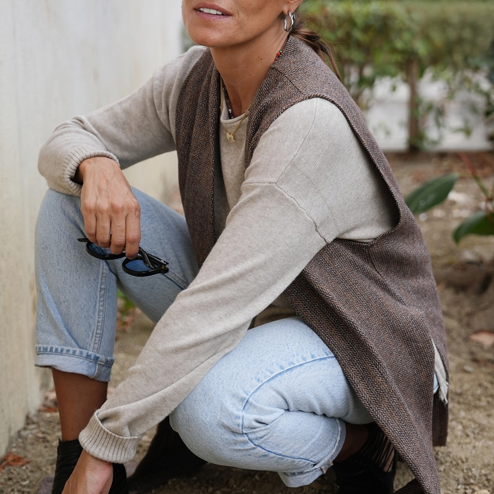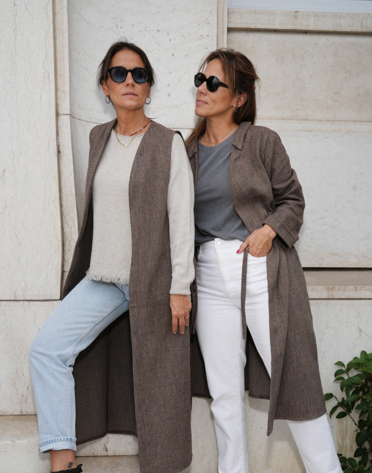 Ideal para disfarçar tudo o que houver para disfarçar, com duas rachas laterais, que tornam este colete mais fluído e com um cair mais elegante.